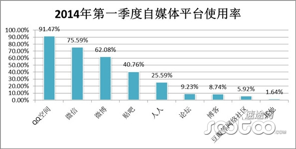 相关调查问卷统计结果分析得出,QQ空间是2014年第一季度使用率最高的自媒体平台,QQ拥有大量的用户群体,在传播上优势明显,但在内容和阅读群体上没有微信、微博更加有影响力,因此QQ空间平台使用率最高,但并不是自媒体的主战场。微信使用率超过微博,从自媒体的发展来看,微博是自媒体兴起的平台,在微博这样一个受众广泛,草根气息浓厚的平台上,自媒体得到了成长的沃土,随着自媒体平台的发展,微信公众平台逐渐成为自媒体的新宠,相较于微博点对面的传播模式,微信与用户进行点对点的交流,互动性更强,用户也更容易接受。贴吧、人人、论坛、博客、豆瓣社区等也拥有一定的使用率。