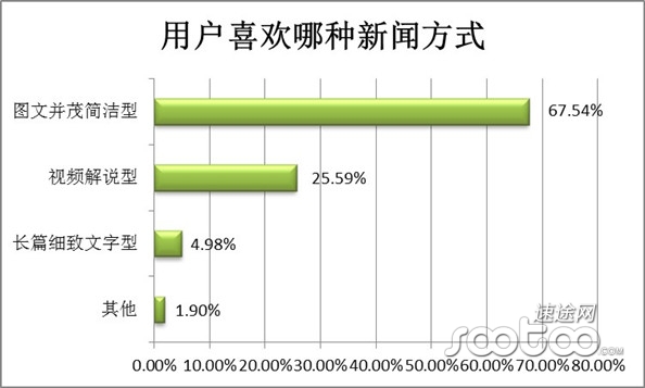 用户更喜欢图文并茂简介型的新闻方式,67.54%的用户喜欢图文并茂简洁型的新闻方式。自媒体作为一种快节奏的媒体形式,长篇累牍只会让用户反感,而简洁的文字,有趣的图片则会吸引用户的眼球,使用户产生阅读下去的兴趣。25.59%的用户喜欢视频解说型的新闻方式,视频解说型新闻是一种新型的新闻方式,视频相比于文字更能吸引用户眼球,因此有一些用户喜欢,目前新闻方式还是以文字为主。