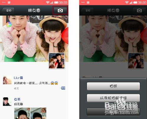 如果是发照片的话,点击右上角的相机,然后选择拍照还是传图就可以了;