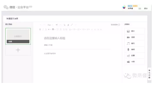 今天下午,微信公众号后台正式开启了新编辑器的内测。微果酱有幸获得此次内测资格,下面就带大家看看新编辑器有哪些变化。