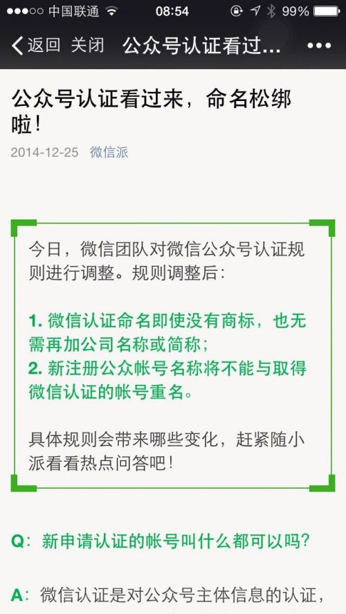 1月5日消息,腾讯公司旗下微信公众账号“微信派”发布的《公众号认证看过来,命名松绑啦》的文章,公布了调整之后微信公号的命名规则。新的规则包括,微信认证命名即使没有商标,也无需再加公司名称或简称;新注册公众帐号名称将不能与取得微信认证的帐号重名。
