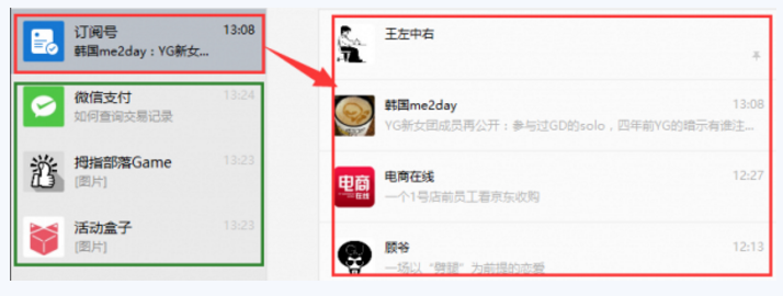 4、在用户微信中展示位置不同。由下图可以看到,所有关注的订阅号都被统一折叠在“订阅号”文档里,在首页只显示总体文档,以及最新推送文章的一小部分,在右上角用小红点提醒里面有更新。而服务号被单独展现在微信首页,信息显示完整,避免了更新时被用户忽略。