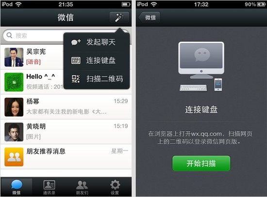 新增的微信网页版将微信带入了PC端。通过在电脑浏览器中打开wx.qq.com以获取二维码,使用新版微信应用扫描二维码并确认后,可在网页端登陆微信,获取聊天界面。值得注意的是,排在网页版微信第一个位置的“文件传输”功能,可以帮助用户在手机与电脑间互发文字、图片、音频、视频以及各种文件类型。