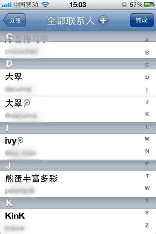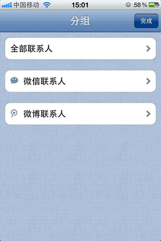 1、通讯录里增加了微博联系人,通讯录分组中会多出一个“微博联系人”分组。
